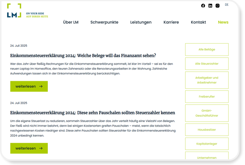 Die Bereitstellung des Newsbereichs auf der LM Audit Website ermöglicht es, aktuelle Fachthemen, Trends und Gesetzesänderungen übersichtlich darzustellen. Gleichzeitig stärkt der Bereich die Sichtbarkeit in Suchmaschinen: Regelmäßige Beiträge verbessern das Google-Ranking, bringen mehr Besucher und positionieren LM Audit als kompetente, moderne Marke.
