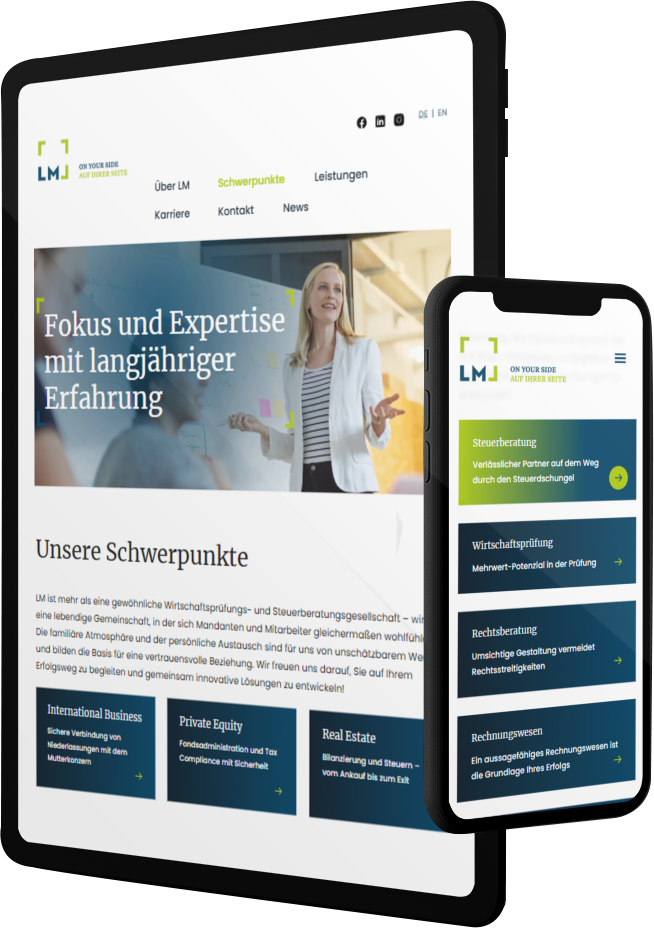 Die LM Audit & Tax GmbH steht für exzellente Wirtschaftsprüfung und Steuerberatung und hat eine überzeugende digitale Präsenz. Gemeinsam mit MXP.digital wurde die Website von Grund auf neu gedacht und umgesetzt. Das Ergebnis: Mehr Sichtbarkeit, bessere Nutzerfreundlichkeit und ein starker Auftritt im digitalen Wettbewerb.